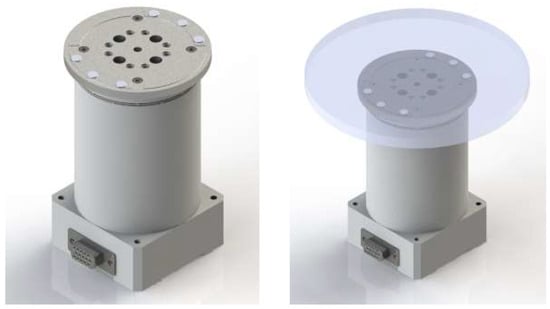 Figure 1a,b shows an exploded and cross-sectional view of the piezo-actuated FSM without the optical mirror. Figure 2 shows an assembled view of the system without and with the optical mirror. To actuate the mover in both rotational directions, the FSM is equipped with two pairs of stack actuators aligned along the system’s two axes and operated in a push–pull configuration. The optical mirror is directly attachable to the top of the mover, and the mover is suspended from an actuator that provides the prepressing of the piezo stack needed for dynamic behavior. The actuators push against the flexible hinge at the backside of the mover and are mounted on a base plate on the FSM system. The mover is designed to be sufficiently stiff for shifting the structural modes of the moving parts to high frequencies while preventing any deformation of the mirror surface during dynamic operation. This is achieved by attaching a solid ø60 × 80.5 mm aluminum cylinder body to the backside of the mover. However, any rotational motion of the mover in the tip or tilt direction would exert shear and tensile forces on the piezo stacks, which must be avoided as they could cause the stacks to crack. Therefore, the piezo stack actuator is built as a housing assembly to avoid cracking in the shear direction.