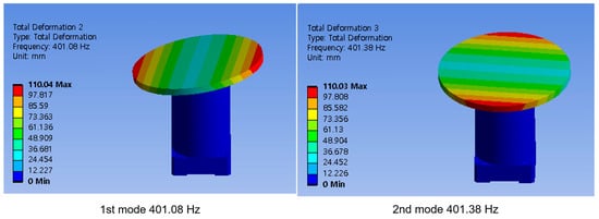 For the flexure design, a simulation-based parameter study was conducted with various materials and thickness configurations to investigate the tradeoff between range loss and the main resonance mode. To achieve a large system bandwidth, the main resonance mode with the optical mirror was targeted to exceed 400 Hz, while the range loss threshold due to prepressing was set as 5%. With stiffness values of kA = 12 N/μm and L0 = 143 μm ± 10% for the maximum range of the stack actuators, a maximum stiffness of 1.48 N/μm was calculated according to Equation (1). As shown in Figure 2, a static mechanical analysis was performed to determine the stiffness kH of each flexure configuration using ANSYS 2023 R1 Workbench (Ansys Inc., Washington County, PA, USA). A modal analysis revealing the structural modes of each flexure was conducted to attain the main resonance tip mode (equivalent to the tilt mode) of each configuration. The first two modes of the obtained flexure are shown in Figure 3. A main resonance mode (tip/tilt motion) appears at approximately 401 Hz. The overall specifications of piezo-actuated FSM with the optical mirror are shown in Table 1.