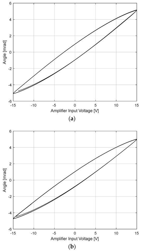 The closed-loop angle control automatically compensates for the nonlinear characteristics of piezo actuators, such as hysteresis (Figure 4), by comparing the target angle with the actual angle measured by the strain gauge sensor. In this paper, the angle control is based on the optimized PI control loop described in Section 3.2 for the designed pie-zo-actuated FSM.