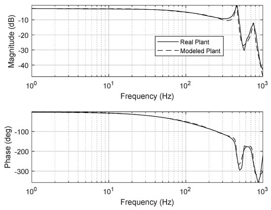 In the FSM motion system, the mechanical aspect was comprised of PZT actuators, while the electrical portion consisted of an actuator amplifier and a sensing signal processing unit. As shown in Figure 1, the PZT actuators were designed with a resistance strain gauge sensor attached to the PZT ceramic surface and were mounted below the mirror to enable tip-tilt motion within the required actuation ranges. Figure 5 shows the mirror-mounted FSM using the PZT actuators, encompassing all the mechanical and electrical components required for tip-tilt motion. Designing a feedback control system generally necessitates identifying the dynamic characteristics of the input and output signals of a real plant. The frequency response of the real plant (i.e., the FSM motion system) in this study was analyzed using a dynamic signal analyzer (35670A, KEYSIGHT, Colorado Springs, CO, USA). The identified dynamic specifications of the real plant are summarized in Table 2. Based on these specifications, the frequency responses of the real and modeled plants for the mirror-mounted FSM using PZT actuators are illustrated in Figure 6.