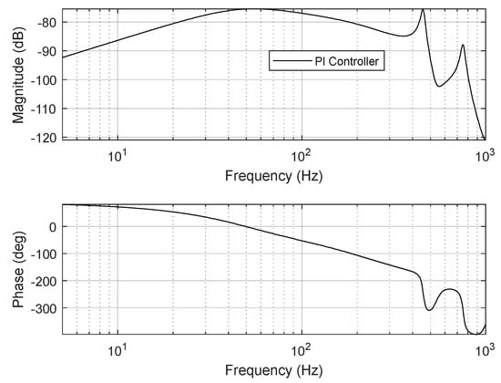 Here, Ts is the sampling time, and kp and ki respectively represent the control gains of proportional gain and integral gain, respectively. The control gains should be designed considering the robustness and stability of the FSM motion system. In this study, the tunable control gains of the PI controller were experimentally set to kp = 0.55 and ki = 1000. Figure 8 depicts the open-loop frequency response of the PI controller designed for the FSM motion system. The gain and phase margins were 11.3 dB and 69.3°, respectively, while the 0 dB crossover frequency and loop gain were 102 Hz and over 30 dB, respectively. The stability gain of the PI controller was selected to achieve the required control performance. The disturbance-attenuation performance of the designed PI controller is presented in Figure 9.