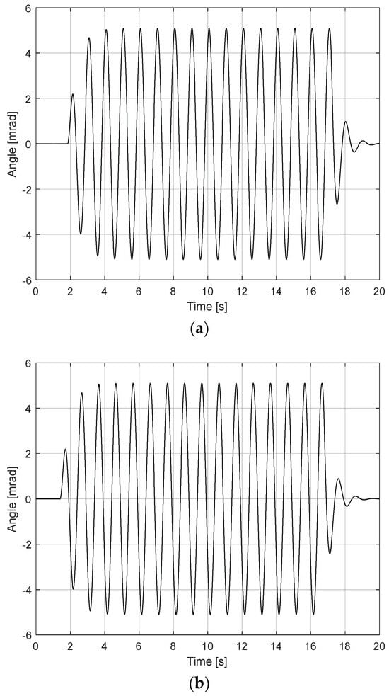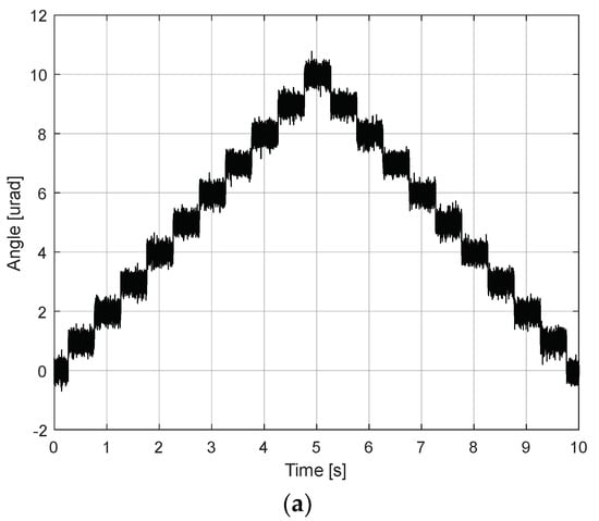 To verify FSM motion performance, the frequency of the reference signal was set to 1 Hz, and the amplitude at the specified frequency point was varied by a maximum angle of 5 mrad until the current limit or maximum terminal voltage was reached, as depicted in Figure 10. This confirmed the robustness of the PI controller’s performance against hysteresis across the target actuation range. To further verify FSM motion performance, repeated step responses of the FSM motion system were measured, achieving an actuation resolution of 1 µrad root-mean-squared (RMS), as depicted in Figure 11. This indicated that the dynamic step responses are nearly identical across various initial conditions.