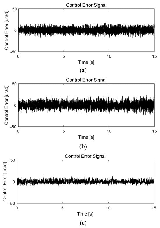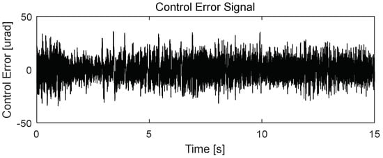 The control input was calculated based on the control law in Equation (7). The phase angles of the AFC algorithm at ω1 = 59 Hz and ω2 = 73 Hz were estimated to be ϕ1 = 81° and ϕ2 = 76°, respectively, based on the update laws in Equations (8) and (9). The experimental results for FSM control using the PI controller, both with and without the AFC algorithm, indicate that the target rotational position was successfully maintained at 0 µrad (i.e., the neutral position). As shown in Figure 6, the residual CES of the PI controller without the AFC algorithm was 12.23 µrad. When the AFC algorithm was used with 59 Hz and 73 Hz disturbances separately, the corresponding root-mean-square (RMS) values of the CES were 7.30 and 9.42 µrad, respectively. These can be observed in Figure 18a,b. When the AFC algorithm was applied with multiple frequency components, i.e., both 59 Hz and 73 Hz concurrently, the RMS of the residual CES was 4.11 µrad, as shown in Figure 18c.