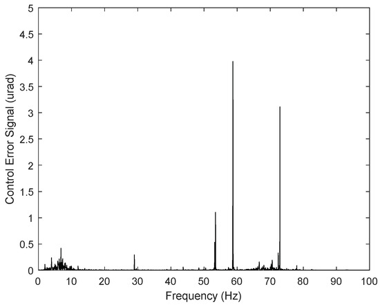 The proposed control system design for the FSM motion in this study simultaneously eliminated periodic disturbance and managed vibrations in the experimental environment. Based on the experimental results obtained when utilizing only the PI controller (Figure 13), the periodic disturbances with multiple frequencies in the CES were primarily caused by mechanical vibrations simulating the target platform. The rotational frequency of the platform cooling fan was 59 Hz, and the corresponding frequency of the platform’s mechanical vibration was 73 Hz, which was applied to the FSM motion system with a vibration generator. Therefore, the power spectrum of the CES (Figure 14) shows that the disturbance was caused by the cooling fan’s rotation frequency (i.e., 59 Hz). Another peak was observed at 73 Hz, corresponding to the mechanical vibration of other parts induced by the fan’s rotation.