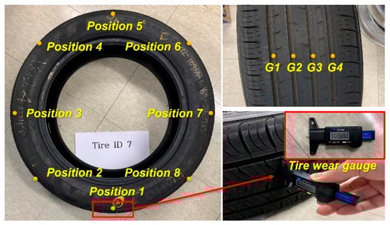 The test tires used were OEM passenger tires manufactured by Kumho Tire (Gwangju, Republic of Korea), with specifications of 215/55 R17. The new tire tread depth, set by the manufacturer, was 8 mm, representing the 0% wear state (or 100% remaining tread depth). Four wear levels were considered based on this initial tread depth of (0, 2, 4, and 6) mm representing (0, 25, 50, and 75) % wear, respectively (Equation (1)). Four tires were prepared for each of these wear levels through a tire buffing process, resulting in a total of 16 tires, each assigned a unique ID (Table 1). The wear amount was determined by measuring the average tread thickness at eight points, spaced 45 degrees apart in the circumferential direction across four grooves, with an average value taken for each tire (Figure 1). Since the tires were artificially worn to approximate the target wear levels, variations in tread wear were present within the same group. For each of the four wear level groups, one tire was reserved for the test dataset, resulting in a total of four tires (ID 2, 7, 10, 14) being used to collect test data. The wear amount was then converted into a wear rate to allow quantitative comparison.