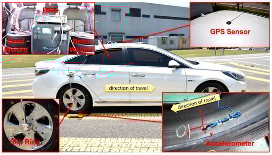 The test tires were then mounted on the left and right rear wheels of the vehicle. A GPS sensor (AA.170, Taoglas, Enniscorthy, County Wexford, Ireland) was installed on the roof to measure driving speed. Tire acceleration signals, captured by the accelerometer, were transmitted to the data acquisition system (SCADAS, Siemens, Munich, Bavaria, Germany) via a slip ring mounted on the wheel, while vehicle speed data from the GPS sensor were stored directly in the DAQ system via a wired connection. Test data were collected during the constant-speed segments of the driving tests at a sampling rate of 12,800 Hz. For each test trial, tire inflation pressure was adjusted using a vehicle air inflation device, with pressure values measured using an electronic pressure gauge (52−53097, Longacre Racing Products, Brownsburg, IN, USA). The target vertical load was verified using a portable axle scale (RWTi–200, CAS Corporation, Yangju-si, Gyeonggi-do, Republic of Korea) and adjusted by placing disk-shaped dead weights on the left and right rear seats of the vehicle.