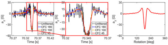 The high-frequency components in the raw acceleration data collected from the tires were attenuated using various classes of CFC filters (SAE, 2007) (Figure 4). CFC45 was selected for tire wear prediction based on its ability to attenuate high-frequency components outside the contact region. Following the procedure outlined by Kim et al. (2023), the filtered acceleration signal for each tire revolution was mapped to the rotation angle, ensuring that each acceleration cycle started and ended at (0 and 360) degrees, respectively. The time axis was divided into 360 intervals for each cycle, and acceleration data at 361 points were obtained by linear interpolation of the filtered acceleration time history. Thus, each data point represented one degree of tire rotation.