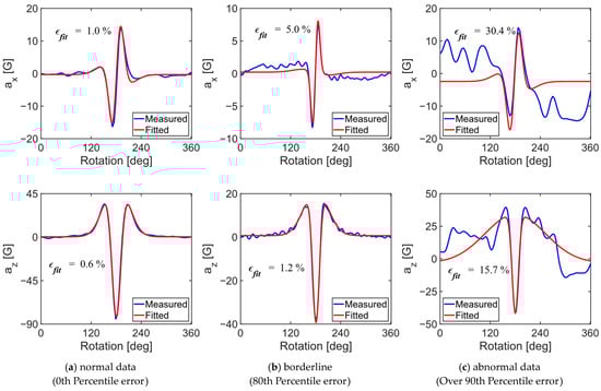 Each acceleration cycle for normal and tangential accelerations was screened to determine whether it should be included in the dataset for the subsequent machine learning step in tire wear prediction. A curve-fitting process was employed to perform this screening objectively. Two parametric empirical functions, each consisting of two Gaussian terms, were used to fit the tangential (x-component) and normal (z-component) acceleration traces with respect to the rotation angle (Equations (2) and (3)). Kim and Kim used Equation (2) to model the shape of a bent gas turbine rotor, which closely resembled the normal component of the tire’s acceleration signal (az) (Figure 5) []. Furthermore, Kim et al. (2023) noted that the jerk term of the normal component of the tire’s internal acceleration was similar to that of the tangential component, leading to the derivation of Equation (3) by differentiating Equation (2).
