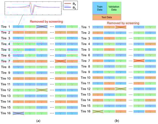 Splitting dataset into training, validation, and test sets for machine learning (a) by tire ID (the current study) and (b) randomly, regardless of tire ID (the conventional method).