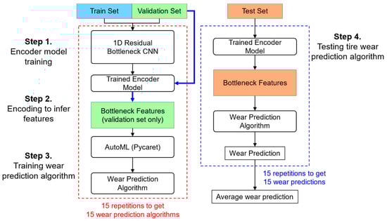 The training and testing of the tire wear prediction algorithms involved the following four steps: encoder model training, feature encoding, training the wear prediction algorithms, and testing the algorithm’s performance (Figure 7). First, the 1D residual bottleneck CNN algorithm was used to train the encoder model with the training data, while validation was performed using the validation data. Second, to prevent overfitting, feature encoding was carried out using only the validation data. Third, the tire wear prediction algorithm was trained using the eight encoded bottleneck features. This process was repeated 15 times to generate 15 wear prediction models, forming the basis for a simple ensemble method. Lastly, the accuracy of the tire wear prediction algorithm was evaluated using the test dataset. The following sections provide detailed descriptions of each step.