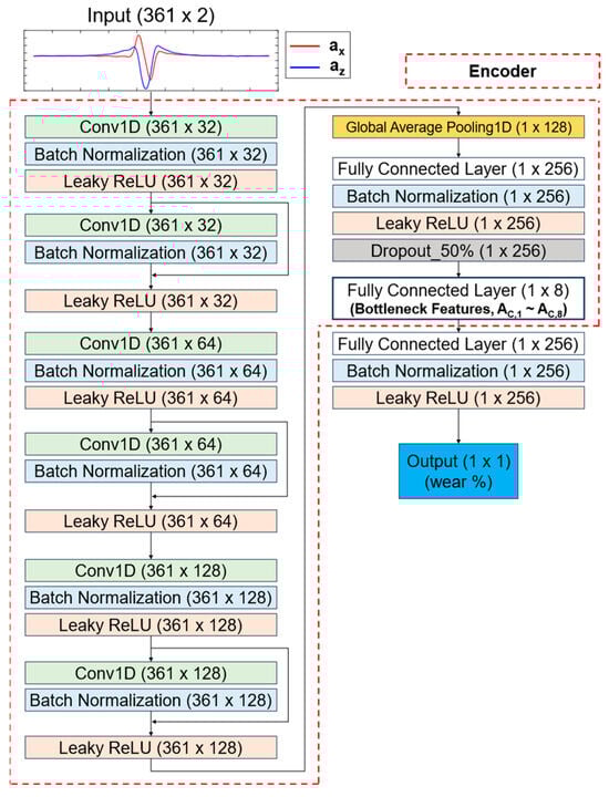 In a previous study, eight bottleneck features were extracted using a one-dimensional (1D) residual bottleneck convolutional neural network (CNN) to effectively capture the key features of 1D 2-channel acceleration data []. In the current study, the 1D residual bottleneck CNN was designed with layers that include multiple residual connection blocks and a bottleneck layer with eight units (Figure 8). The addition of the residual layers helped mitigate the vanishing gradient problem. The 1D residual CNN, along with the bottleneck features, was trained and validated using experimental data from 12 tires (Table 1), with a 50:50 split between the training and validation sets. This process was repeated 15 times to obtain 15 trained encoder models, which were used in a simple ensemble method to predict tire wear (Step 4 in Figure 7).
