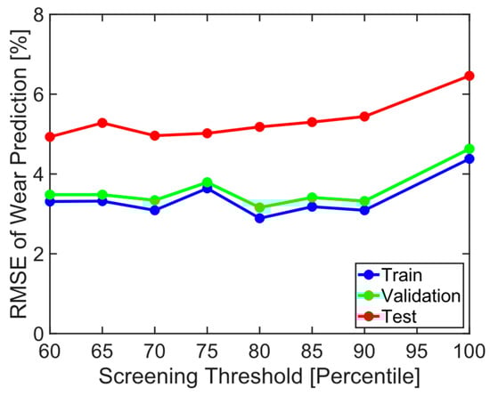 Figure 9 shows three pairs of curve-fitting results for the acceleration signals, representing normal acceleration data, borderline acceleration data, and abnormal acceleration data. As the fitting error increased, the measured acceleration signals deviated from the typical shapes of the tangential (ax) and normal (az) acceleration traces. The threshold for deciding which acceleration traces to include was determined based on the accuracy of the tire wear prediction. The prediction accuracies for the validation data were examined against various threshold values for screening acceleration data (Figure 9). The term “100%” indicates no screening, while “60%” refers to filtering out 40% of the acceleration signals with the largest errors. The performance on the test data generally improved as more filtering was applied. It was found that using the top 80% of the data yielded the best performance for the validation set. The curve-fitting error threshold for this condition was approximately 5% for ax and 1.2% for az. In other words, if the error for ax exceeded 5% or the error for az exceeded 1.2%, the data were considered abnormal and were discarded. Since both the normal and tangential acceleration signals needed to be in the top 80% simultaneously, this process screened out 73,145 acceleration cycles out of 249,192, retaining 176,047 cycles (70.64% of the entire dataset) for training, validation, and testing. Because the threshold was determined based on the validation set, this step will not be necessary for future tire wear predictions.