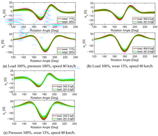Sensitivity of tire acceleration signals with respect to (a) wear amount, (b) tire internal pressure, and (c) tire vertical loads.