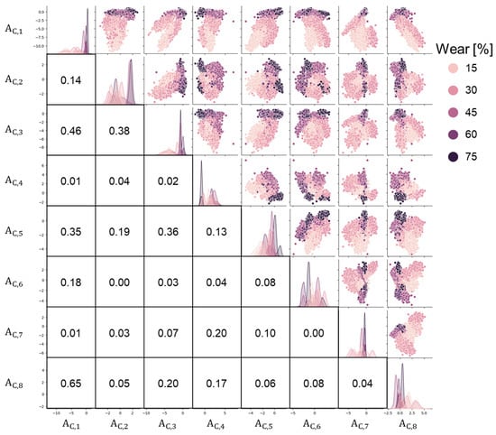 Figure 10 demonstrates the sensitivity of the test parameters on the tire’s internal accelerations. The pairs were selected under identical conditions, except for the differences indicated in the legends. Variability in the acceleration signals can be observed even under the same conditions, leading to overlaps between the signals from adjacent conditions. These overlaps may pose challenges for accurate wear prediction. Figure 11 shows pair plots of the eight bottleneck features (AC,1 to AC,8) obtained from the 1D−ResNet method using the training data, with wear amounts represented by five different colors. Since the training set contained over 100,000 cycles, the figure was produced by randomly sampling 1200 samples from the dataset of 12 tires (Table 1). The eight bottleneck features formed clusters corresponding to different tire wear amounts, indicating their potential usefulness to predict tire wear. For example, the cluster representing 75% wear was concentrated in the top-left corner of the scatter plot between AC,1 and AC,4. In general, AC,1 and AC,2 exhibited a monotonically increasing trend with tire wear amounts, but significant overlaps between different wear groups were observed. This overlap suggests that predicting tire wear based on a single bottleneck feature may be challenging. These eight bottleneck features were used in conjunction with AutoML for tire wear prediction.