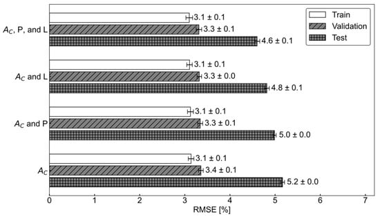 It was found that tire wear can be predicted sufficiently well using only the bottleneck features derived from internal tire acceleration data without the need for pressure and load information. This result aligns with the findings of Kim et al., who conducted a similar analysis using acceleration data generated from finite element (FE) analyses []. Although pressure and load clearly affect tire deflection, their inclusion only marginally improved wear prediction performance. Adding either tire internal pressure, vertical load, or both reduced the prediction error by less than 0.7% RMSE (an 11% improvement compared to using only AC data). Tire wear prediction relied primarily on the shape of the tire’s internal acceleration signal.