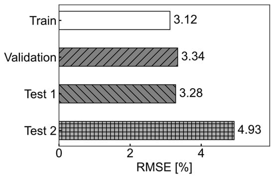The tire wear prediction accuracies from the two data splitting schemes—dividing the data based on tire ID versus randomly splitting the data regardless of the test specimens—were compared (Figure 13). It was found that randomly splitting the data without considering the test specimens tended to underestimate prediction errors. The RMSE of the tire wear prediction for the Test 1 dataset was 1.7% lower than that for the Test 2 dataset, which consisted of the four test tires with tire IDs of 2, 7, 10, and 14 (Table 1).