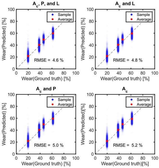 Tire wear amounts were predicted using four combinations of feature sets. The bottleneck features (AC) were used as the primary feature set, while tire internal pressure (P) and vertical load (L) were added in different combinations to evaluate their impact on prediction accuracy (Equation (5)). When only the primary features (AC) were used, the average prediction accuracy for the test data was 5.2%, corresponding to an average prediction error of 0.42 mm across multiple repetitions (Figure 12). Figure 12 shows an example of several trials of tire wear prediction. When tire internal pressure (P) or vertical load (L) were added as additional features, the prediction error decreased by (0.2 and 0.4)%, respectively. Interestingly, when both pressure and vertical load were included, the prediction error dropped by 0.6%, which equaled the combined individual improvements of (0.2 and 0.4)%.