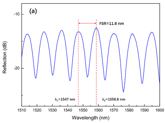 The FSR of the sensor read out in Figure 3a is 11.8 nm. Since the FP cavity of the sensor is an air cavity and the refractive index of air at room temperature is 1.00029, the cavity length L of 102.4 µm can be obtained by using Equation (1). This is approximately consistent with the cavity length (~100 µm) of the sensor we made.