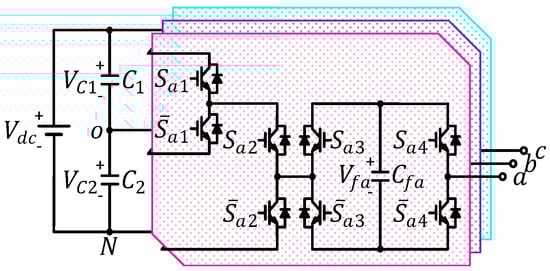 The generalized structure of three-phase hybrid cascaded H-bridge (HCHB) inverters is illustrated in Figure 1. This topology consists of two split DC-link capacitors ( and ), one flying capacitor (), and four pairs of complementary switches at each phase leg (: , , or ).