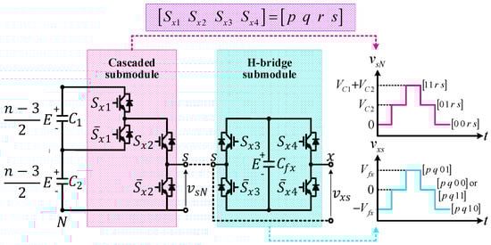 When each phase leg is seen as the combination of one cascaded submodule and one H-bridge submodule, as depicted in Figure 2, the synthesis of output voltage at every phase is defined as follows: