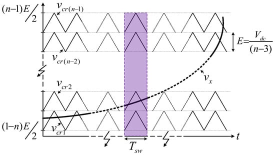 In the previous study [], a three-phase 7L-HCHB inverter was developed and operated with an in-phase disposition level-shifted multicarrier PWM (IPD-LSPWM), as illustrated in Figure 3. In this technique, the voltage reference at each phase leg is compared with the carrier waveforms () to determine the switching of each device [].