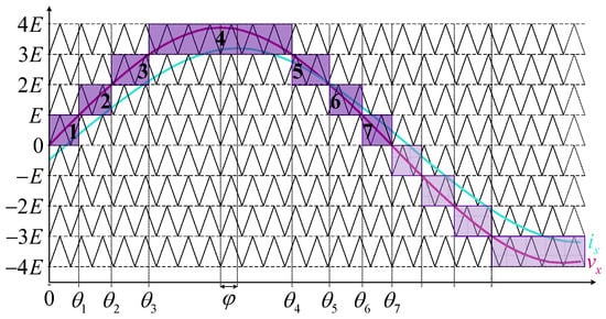 A similar approach can be applied to analyze the balancing capability of any -level HCHB inverter. For instance, the output voltage and current of a 9L-HCHB inverter are illustrated in Figure 4, where the staircase waveform during half of the fundamental cycle can be divided into seven areas. The demarcation angle for each area can be calculated based on the geometrical correlation as follows: