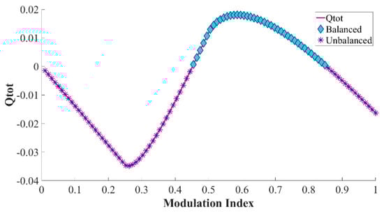 Note that only determines the amplitude of , whereas the polarity remains identical. Since the value of in each graph is not always positive, voltage drifts are expected to take place in any -level HCHB inverter when it is operated at various modulation indices and power factors. For instance, consider the charge variation in the flying capacitors of 9L-HCHB inverter for cos () = 0.83, as illustrated in Figure 6. In this case, the value of is negative at 0.45 and 0.84, where voltage imbalance is expected to occur. Such operating range limits adversely negate the benefit this structure offers, i.e., flexibility to increase the number of levels, and thus diminish the competitiveness of this topology.