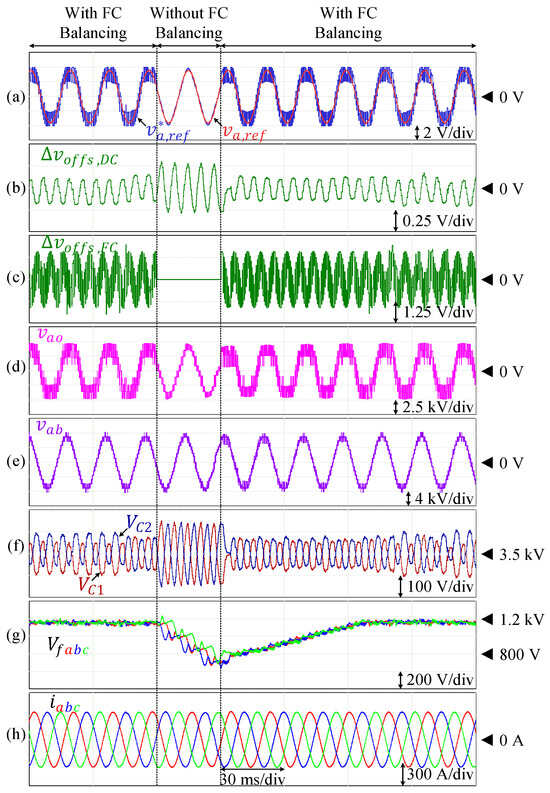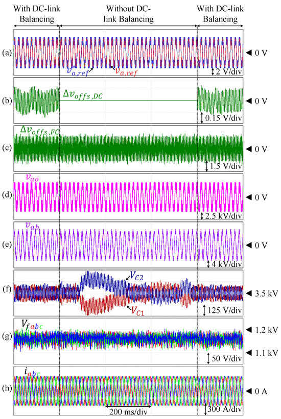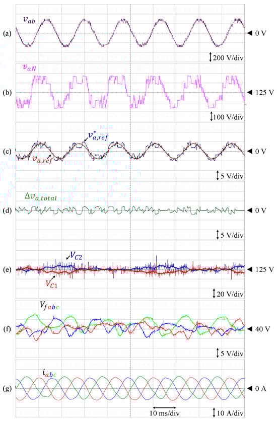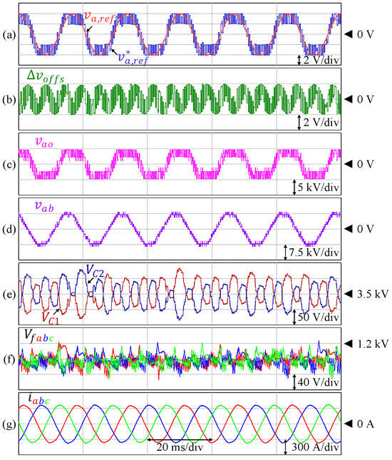Performance of 9L-HCHB inverter prototype at unity modulation index. (a) Line voltage. (b) Pole voltage. (c) Reference voltages. (d) Injected offset voltage. (e) Split DC-link capacitor voltages. (f) Flying capacitor voltages. (g) Output currents.