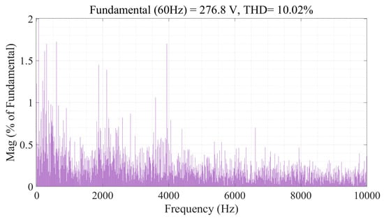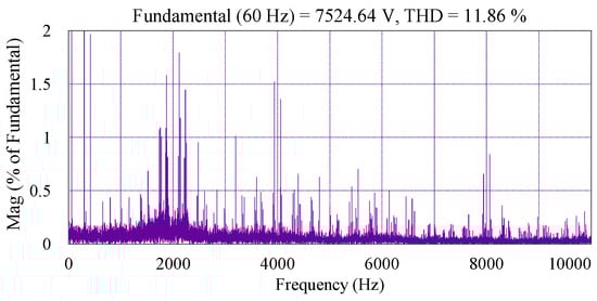 The performance of a 9L-HCHB inverter during a steady state in the unity modulation index is shown in Figure 8, where both pole and line voltages exhibit the maximum number of levels. In order to maintain the capacitor voltages, the reference voltage at each phase leg () is injected with the offset voltage (), and thus results in the generation of a new reference voltage (). DC-link and flying capacitor voltages are regulated at 3500 V and 1166.67 V, respectively, where the maximum ripples are 2.37% and 5.07% of the references, respectively. The harmonic spectrum of line voltage is shown in Figure 9, where the THD is 11.86%.