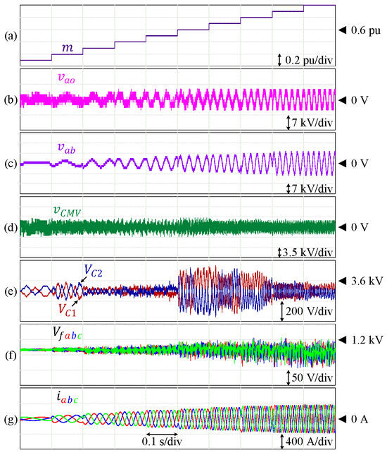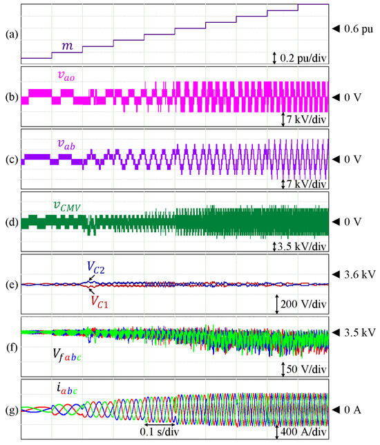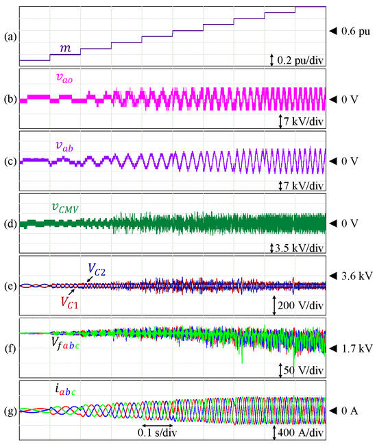 Performance of 7L-HCHB inverter at various modulation indices. (a) Modulation index. (b) Pole voltage. (c) Line voltage. (d) Common-mode voltage. (e) Split DC-link capacitor voltages. (f) Flying capacitor voltages. (g) Output currents.