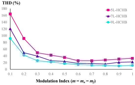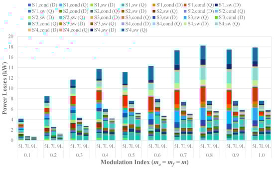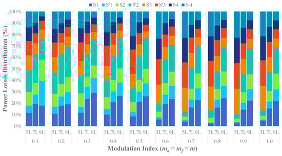 Since the voltages of split DC-link capacitors of most HCHB inverters are higher than those of the flying capacitors, the voltage stress of each switch in the cascaded submodule is also higher than those of the H-bridge submodule. In addition to producing lower voltage steps () at each phase leg, the inverters with a higher number of levels also exhibit lower total standing voltages (TSV) due to the lower voltage stress at H-bridge submodules, as listed in Table 2.