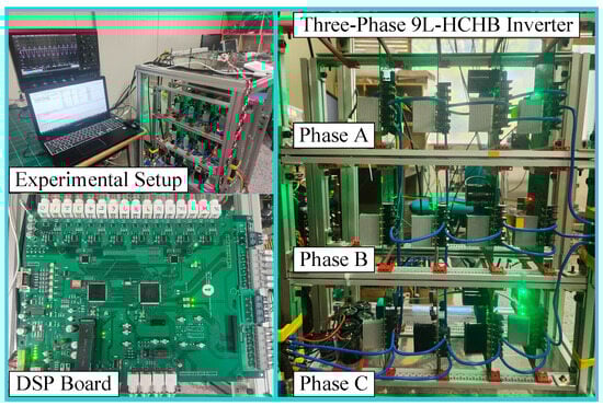 In order to further validate the proposed operating scheme, a down-scaled three-phase 9L-HCHB inverter has been developed and operated with the parameters listed in Table 6. This prototype is controlled with a DSP chip (TMS320F28335)( Manufacturer: Texas Instruments Incorporated City, country: 12500 TI Blvd., Dallas, Texas 75243 USA) and a field-programmable gate array (Xilinx XC3S400) (Manufacturer: Xilinx, Inc., City, country: San Jose, CA, USA), as shown in Figure 19.