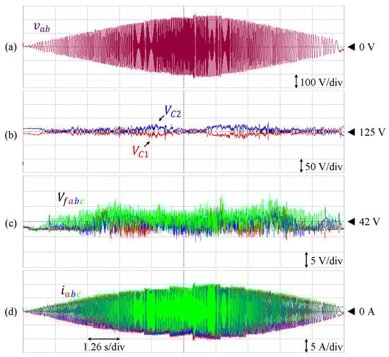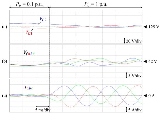 Figure 23 shows the transient state responses for load variation, where the load is increased from 12.7% ( = 318 W) to 100% of the rated value ( = 2.5 kW). Each of the DC-link and flying capacitor voltages is also maintained at the corresponding reference.