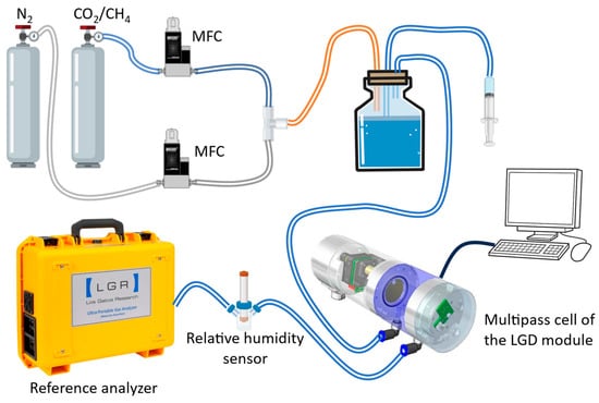 Schematic representation of the experimental setup to investigate the effects of humidity on the CH4/CO2 concentrations from the LGD module.