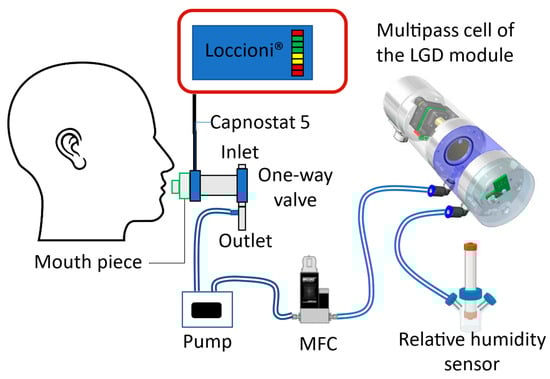 The CAPNOSTAT® 5 CO2 sensor monitors the mainstream of exhaled CO2 and is connected to a commercial breath sampler (Loccioni, Angeli di Rosora, Italy) that allows the exhalation profile to be displayed on a screen. It also serves as the reference for CO2 measurement with the LGD module-based sensor in case of real-time breath experiments. The relative humidity sensor is inserted after the sensor for calibration during the data processing.