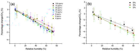 The percentage change in the measured concentrations of (a) CH4 and (b) CO2 using the LGD module in different relative humidity. The measured concentration values of both species show a relative (rather) linear trend of decreasing with respect to increase in the relative humidity from 0% to ~80%, around 3% for CH4 and 7% for CO2.