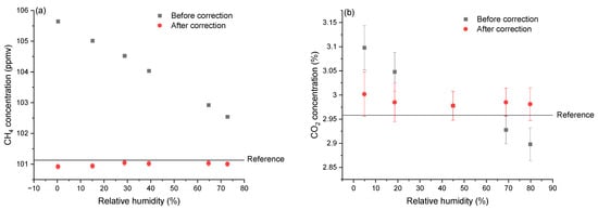 To evaluate the performance of the correction functions, we compare the values obtained before and after correction with the values provided by the reference analyzer for CH4 and the diluted concentrations of the calibrated gas mixture for CO2. The comparison allows us to assess the accuracy of the correction functions in removing the cross-detection effect of humidity. Figure 4 shows examples for applied concentrations of ~100 ppmv CH4 and ~3% CO2 with the measurement values before and after correction obtained from the LGD module, as well as the reference values in terms of different relative humidity. After applying the respective correction functions to both CH4 and CO2, the values are much closer to the reference values. Table 1 shows the measurement errors (while varying the relative humidity from 0% to 80%) before and after correction, compared to the values from the reference analyzer for CH4 and the calculated concentration values after the dilution of the certified cylinder for CO2, for the entire range of applied concentrations. The error from the measurement is less than 1.5% (for high concentration, >10 ppmv) and less than 3% (for low concentration, <10 ppmv) for CH4, while the error is always below 1.4% after the correction for CO2. Note that our correction method can be applied to other sensors with different working principles and techniques, as long as the effect of the interfering species on the measurement stays quantifiable and reproducible.