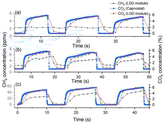 Real-time measurements of three breath profiles of CH4 (in black) and CO2 (in red) from three healthy participants (a–c) performed with the breath sensor based on the LGD module. For comparison, the CO2 profile recorded with the CAPNOSTAT® 5 CO2 sensor is shown in blue.