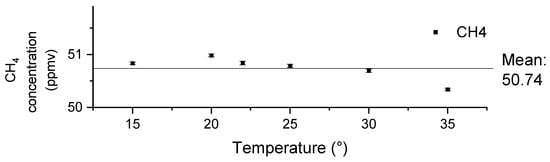 The influence of the temperature in the environment is also investigated by continuous measurements conducted at various temperatures. For this, the LGD module-based sensor is placed inside an environmental test chamber (MLR 351H, Sanyo Kogyo Co., LTD., Meguro-ku, Japan), where the temperature is set to 15 °C, 20 °C, 23 °C, 25 °C, 30 °C and 35 °C, respectively. Each temperature is maintained for approximately 30 min. The sensor is flushed with a continuous flow of ~50 ppmv CH4 prepared from a certified gas mixture of CH4 in synthetic air [101.5 (±2) ppmv, Linde Gas Benelux, Dieren, The Netherlands] and further diluted (50/50) by pure nitrogen. The relative humidity is controlled within the range of 6% to 29% during the experiment. Figure 6 shows the measurement values at different temperatures. Each value is obtained by averaging data over a 10-s period, while the standard deviations are calculated based on nine consecutive measurements. After applying the correction function, the measured values fell within the range of the applied concentration [50.75 (±1) ppmv, verified by the reference analyzer]. Despite variations in temperature, the largest deviation observed in the readings is 0.5 ppmv, representing a 1% deviation from the applied concentration. Therefore, these results indicate that with the correction function in place, the sensor exhibits good stability across various environmental temperatures.