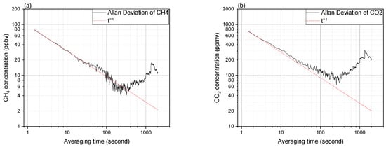 The Allan–Werle plots for detected concentration of (a) CH4 and (b) CO2. Fitted t−1/2 dependency representing the white noise contribution (red dashed line).