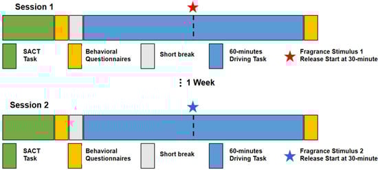 Schematic overview of the experimental procedure. Study participants underwent two experimental sessions, each consisting of the following sequence of events: SACT task to assess baseline attention state for the respective session; behavioral questionnaires (KSS); short break 10 min; 60-min driving task, during which the fragrance stimulus corresponding to that session started to be released at the minute 30 mark; behavioral questionnaires (KSS, alerting/relaxing; NASA TLX). The order of the two sessions (corresponding to the two fragrance stimuli) was randomized across subjects.