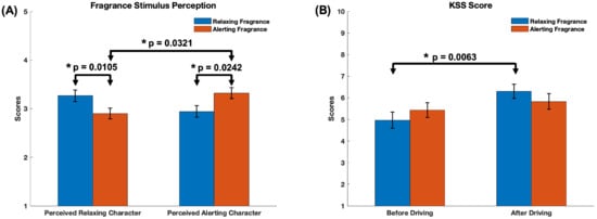 (A) The bar graphs illustrate the average ratings on perceived fragrance stimulus character (1 = Strongly No, 2 = No; 3 = Neutral; 4 = Yes; 5 = Strongly Yes). The ratings represent averages of the scores of the corresponding set of questions (relaxing and alerting character) for each of the two fragrance stimuli (coded here as relaxing and alerting fragrance). (B) the scores corresponding to the Karolinska Sleepiness Scale (KSS). 1 = Extremely alert; 10 = Extremely sleepy. Error bars represent standard error of mean. Statistical significance was determined with a significance level of p < 0.05 (*).