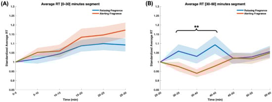 The graph illustrates changes in braking reaction time over 30-min segments: (A) without fragrance stimuli, during the [0–30] min segment, and (B) with the fragrance stimuli during the [30–60] min segment of the driving task. The two lines represent the two experimental sessions, corresponding to the two fragrance stimuli. The X-axis represents experimental time over 5 min epochs, and the Y-axis represents standardized average reaction times. Statistical significance indicates differences between the two groups during the [30–45] min segment, with a significance level of p < 0.01 (**). No statistically significant differences were observed in the [0–30] min segment.