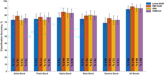 The significantly different EEG metrics were then used to assess their accuracy in discriminating between the two experimental conditions. Classifier models were trained on subject-level data corresponding to the metrics within individual frequency bands, as well as on the complete dataset (i.e., merging metrics from all frequency bands). The RBF-SVM (parameter C = 10) consistently yielded the highest classification accuracy scores, with the complete dataset model resulting in a classification accuracy of 92.1 ± 1.9% (Figure 5). The kNN (parameter k = 3) and XGBoost ( = 1) classifiers achieved remarkable classification performance (89.9 ± 2.1% and 89.6 ± 2.4%, respectively), while the Linear-SVM yielded a 88.3 ± 2.6% accuracy. Among the classifiers trained on the EEG metrics within individual frequency bands, the alpha band classifiers, the highest classification accuracy was achieved by the RBF-SVM (84.5 ± 2.3%) followed by the kNN classifier (82.9 ± 2.8%).