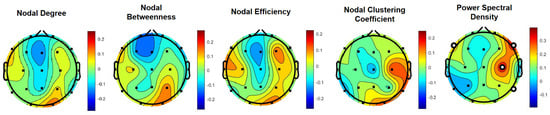 The four graph metrics (clustering coefficient, node degree, node betweenness, and node efficiency) represent two types of brain network properties that are crucial for achieving cognitive function []: (i) functional integration, and (ii) measure of functional segregation. Functional integration refers to how efficiently information is distributed across brain areas and can be indexed by the nodal degree, nodal efficiency, and nodal betweenness metrics. Functional segregation represents the extent to which brain function is segregated into local functional modules that perform specialized cognitive functions. In our case, functional segregation is quantified by the clustering coefficient metric, which is estimated as the average number of network triangles formed around each network node i (three nodes connected to each other) divided by the number of edges these neighboring nodes have with node i.