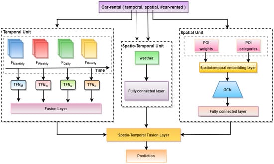 Our approach incorporates three distinct units: a temporal feature unit, a spatial feature unit, and a spatio-temporal feature unit []. The different units extract key frames, enabling an accurate prediction of travel demand. The temporal unit is designed to capture temporal dependencies and comprises four layers, each corresponding to a different time scale. The spatial unit focuses on capturing spatial dependencies using Points of Interest (POIs), while the spatio-temporal unit integrates weather data to effectively capture spatio-temporal correlations. Finally, the outputs obtained from each unit are combined in the feature module fusion and training unit to generate accurate predictions of passenger demand.