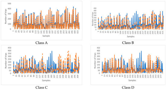 We applied our model to the entire dataset, demonstrating its robust performance in predicting car-sharing demand. To further analyze the model’s performance, we also implemented our analysis in four distinct classes. For the sake of organization and not being redundant in our explanations, we only discuss the result analysis of class “A”, as other classes exhibit the same behavior and lead to the same conclusion [].