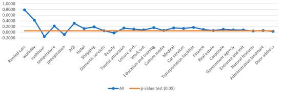 As can be seen in Table 6, numerous factors, such as the number of rented cars ( = 0.7865, p-value = 0.002), workday (= 0.4223, p-value = 0.005), and temperature ( = 0.2156, p-value = 0.034), positively influence car-sharing demand. Conversely, rush hour ( = −0.1523, p-value = 0.023) and precipitation (= −0.0842, p-value = 0.046) have negative coefficients, indicating a drop in car-sharing demand during these periods. Analyzing the influence of POIs on car-sharing demand reveals that factors like domestic services (p-value = 0.214), beauty (p-value = 0.467), culture media (p-value = 0.165), real estate (p-value = 0.134), government agency (p-value = 0.456), entrance and exit (p-value = 0.145), natural features (p-value = 0.214), administrative landmarks (p-value = 0.145), and door address (p-value = 0.130) have p-values higher than 0.05, indicating their insignificant influence on car-sharing demand.