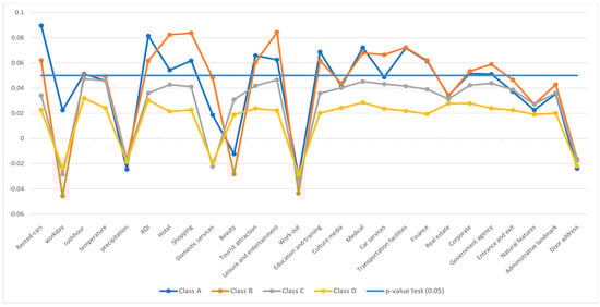 Several important POIs play a crucial role in influencing the strong car-sharing demand in Table 7—Class A. Tourist attractions ( = 0.0659, p-value = 0.002), education and training centres ( = 0.0687, p-value = 0.007), medical facilities ( = 0.0721, p-value = 0.001), finance hubs ( = 0.0614, p-value = 0.001), and government agencies ( = 0.0510, p-value = 0.032) exhibit a positive impact on car-sharing usage within this class. This suggests that areas with these amenities typically have greater rates of car-sharing use.