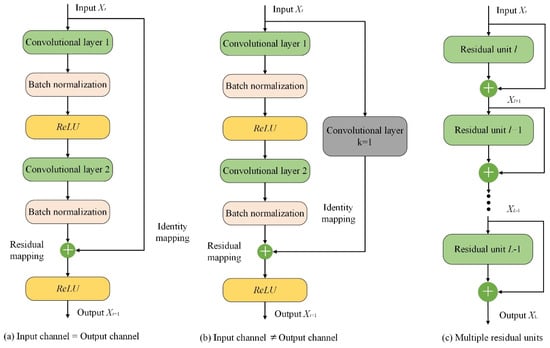 During the convolution operation, the number of channels in the input data  may differ from that in the output data . In such cases, a convolution with a kernel size of 1 is required to either increase or decrease the dimensionality of the input data, ensuring consistency in the number of channels between the input and output data. This principle is illustrated in Figure 1b, where the output of the residual unit can be calculated as follows: